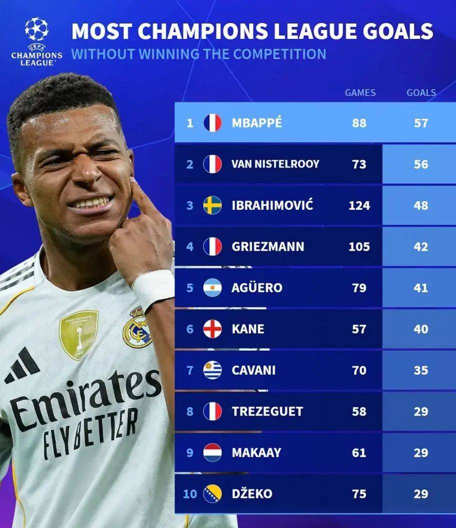 谈及欧冠进球,各种角度的榜单层出不穷。C罗曾创下单个赛季17球的纪录。近年来,随着姆巴佩在欧冠赛场上不断刷新进球纪录,一个特殊的榜单在欧洲足坛悄然走红,而姆巴佩则高居榜首。然而,可以肯定的是,姆巴佩并不希望永远占据这个榜单的首位,因为他来到皇马的目的,正是为了从这份榜单上除名,彻底告别。